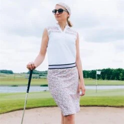 Anne skort is made of a functional fabric that is stretchable and breathable. The fabric also has drycool and wicking effects. Two front pockets and one back pocket. A decorative elastic waistband with stripes gives a sporty look. Inner shorts in mesh. Abacus logo above right hand side back pocket. Length 19 inches (50cm)
