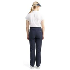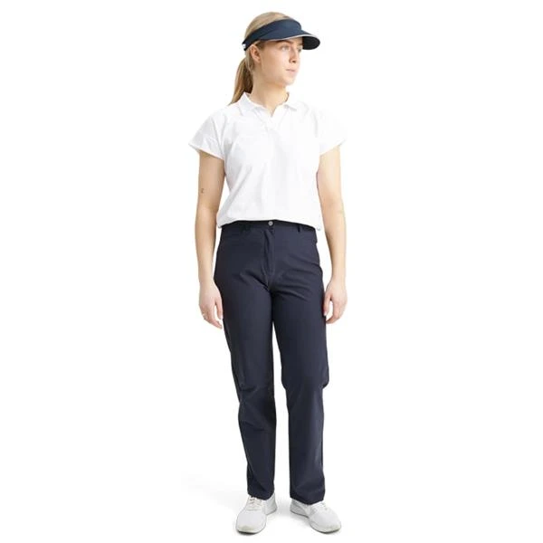 These navy trousers are made of a very soft 4-way stretch material that is lightweight and breathable. The fabric also has drycool and wicking effects. Mid waist and straight leg with two front and one back pocket. Abacus logo at right back pocket.