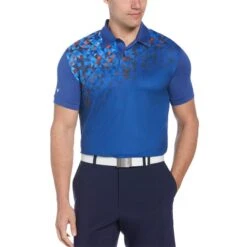 Conquer the course in this fashionable and functional men’s golf shirt from Callaway. A colorful asymmetrical mural print draws the eye to the top of this short sleeve golf polo. Durable single-knit fabric enhanced with stretch helps to maximize your range of motion so you can swing without restriction. A self polo collar with two-button placket allows for easy on and off and this golf top contains 30% recycled polyester for an eco-friendly advantage.