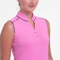 EPNY Ladies Sleeveless Y Neck Mandarin Collar Polo Shirt Rosa Multi